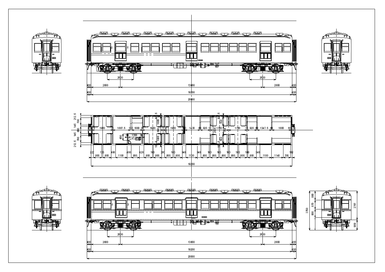 鉄道省モハ40系のサロハ56000形2,3等合造付随車です。比較的近距離で2等車の需要がそれほど多くない京浜東北専用として、半室を2等車とした2,3等合造車として製造されました。車体長19200mm、車体幅2805mmの標準車体に、3等車側はモハ41形連結面側と同じ構造のセミクロスシート、2等室側は戸袋部を除き、シートピッチ1960mmのゆったりした固定クロスシートとなっています。2等室戸袋部の一端に洋式便所が取り付けられました。両数はそれほど多くありませんが、製造時期が違っているため、いろいろなタイプの車体構造があります。戦時輸送のため2等車の廃止に伴い、サハ57形に編入されましたが、戦後すぐに進駐軍に接収され進駐軍専用車として整備された後、変換に伴い、サロハ56形に復帰、2等室が復活しました。新性能化に伴い、地方線区に移るときに旧2等室は室内はそのまま普通車に格下げされました。実車は3扉2,3等合造車で、2等室は中央部に4組のシートピッチ1760mmの固定クロスシート、その他はゆったりとしたロングシート、3等室側はロングシートでした。戦時輸送体制で2等車が廃止されたときにサハ57に編入の上仕切りの撤去、全室ロングシート化に改造され、その後は2等室は復旧されませんでした。図面上段は張上屋根ノーシルノーヘッダ車、下段はシルヘッダー付きの張上屋根車です。