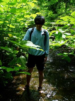 | 一時はピンチと思ったが、冷たさにはすぐに慣れ、じゃぶじゃぶと順調に進んだ。 長靴源造は、沢の深さのせいで浸水し、足を上げて排水作業を繰り返していた。 倒木が多く、身を屈めてくぐったり、跨がなければならない場面が多々あり、苦戦。 そして私はデジカメの命を守るために悪戦苦闘(他の2人のカメラは防水)。 カメラ持ってこなけりゃ良かったなあ。 なかなか一筋縄にはいかぬこの川。 我々の前にさらなる障害物が放たれた。 写真奥に写る砂防ダムである。 地図を見れば分かるが、滝までの道程には三つの砂防ダムがある。 その第一弾が登場したのである。 ゴウゴウと水を落とす砂防ダム。 古ぼけたダムの両岸は滑りやすい斜面になっており、迂回するのが若干困難。 各自軍手をはめ、四足歩行で堤の脇の斜面を登る。 砂防ダムの多さ、滝の多さ、倒木の多さから見ると、この川の険しさが分かる。 雨の日などはそれなりの暴れ川になるのだろうか。 今日の流れは非常に平和であるが、あちこちに転がる残骸を見るとモイチャン川の恐ろしい面が見える気がする。 そして2つ目の砂防ダムも同じように乗り越え、今最後の砂防ダムの堤を越えた。 あちゃー。 事前の情報で聞いてはいたのだが、最後の砂防ダムはやはり水をたんまり湛えていた。 深さは腰くらいだろうが、ヌップヌップと沈んでしまいそうだ。 岸辺を行くしかない。 我々はジャングルと化した岸の斜面を睨んだ。 スポーツサンダルが苦手とする、トラバースの始まりである。 おわっぷ!! これは厳しいぞ!! 斜面にへばり付く植物、枝を這わせる木々、滑りやすい土、そこに張りつく我々。 そのまま池へと滑落できれば、まだマシなのだが、この斜面は一筋縄にはいかない。 足を滑らせれば、枝や植物が絡み合うビーバーの巣の如き天然の罠に陥り、抜け出すのが困難になる。 出来るだけ太い枝に自らの体を預けながら、ゆっくりと進むしかない。 ここのトラバース区間は枝をくぐったり乗り越えたりするだけでは、乗り切れない。 時には枝から枝へと、猿のように渡らねばならぬ場所もある。 そんな池迂回区間ももう終盤。 いやぁ、手こずった手こずった。 何とか、川に戻る。 汚れた足を洗い、遡行を再開。 ここから先は小さな滝と釜の連続で、歩くルートが限られる。 困難の連続だが、命の危険を感じるような所は今のところない。 しかしリュックサックの中のデジカメの安否がやはり気がかりである。 滑りやすい箇所が幾つかあるが、「一転倒=デジカメ死亡」という公式はかなりのプレッシャーであった。 ん・・・? 重苦しい断崖が迫ってきた。 そして縦に落ちる水流が木々の間から・・・。 うお———!!!! 巨瀑!! |