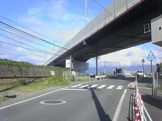 話はそれたが、目の前にあるのが問題の立体交差である。この県道とその隣の長野電鉄の複線線路を、車両基地に至る長野新幹線の高架橋が一跨ぎにしている。これだけならば、特に話題に引き出す必要もない普通の立体交差だ。