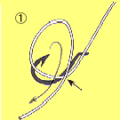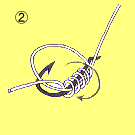 | 結び⑤針にハリスを結ぶ ①の矢印部を指で抑えて②に進む | |||