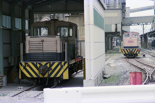 | 香春駅近くにある日本セメントの工場にも専用線があった。工場の規模が大きく、使われていた機関車 も50tと35tで大型だった。手前のカニ目の機関車が日立の50tで、奥に見えるのが35t機。 これを撮影した当時は、旧夏吉貨物駅を経由して田川線の勾金から苅田港へと専用貨物が走っていた。 かつては手前に見えるガードレールの方へも線路が延びていて、日田彦山線の香春から東小倉(高浜) や葛葉にも頻繁に専用貨物が走っていた。香春からは国鉄のDD51が直接工場内へ入ってきていた、 |