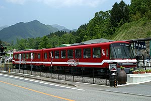 陽光でアスファルトがギラギラと輝いていた。その割には思ったほど暑くない天気。 小さな集落の仲を突っきり、緩やかなカーブを右へ左へと抜けていくと、前方右手に真っ赤な2両編成の気動車が見えてきた。“