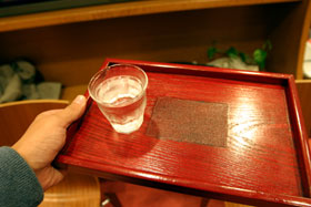 だがしかし、評価の時間は長くない。16銘柄の焼酎と5社の鶏肉を味わい尽くせるか・・・。さらにその中でカメラのファインダーを覗くというハンデを自ら負ってしまっているので、忙しいことこの上ないではないか(爆)。 というわけでして、参加者それぞれに渡されるお盆の上にチェイサーを載せつつ、焼酎の並んだテーブルへといそいそと向かったのであった。
