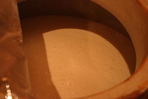 再度二重になっている引き戸を開けると、次の部屋にはカメが整然と並んでいた。画像のもっと手前にこれらカメよりも一回り大きなカメが埋められている。1次仕込みのカメである。櫂で良くかき混ぜて、この仕込んで2日目というもろみをコップに注いでくれる。口に含んだ感じはヨーグルトというか日本酒というか、クリーミィで濃厚な風味であった。ここで十分に酒母が育つのを待って、から先ほどの恒常的作業場において蒸した米を加え、奥のカメで再度微生物の働きに委ねることとなる。